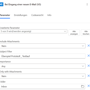Ich nutze den Trigger „Bei Eingang einer neuen E-Mail (V3)“ und filtere nach Betreff.HTML in Text umwandeln