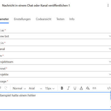 In beiden Fällen lasse ich Power Automate eine Nachricht in Teams ausgeben, über den Baustein „Nachricht in einem Chat oder Kanal veröffentlichen“.Fehler gefunden: „Überspiel hatte einen Fehler“ inkl. Absender und Betreff der Mail.