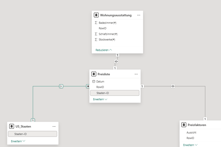 Für ein sauberes Modell verbinde ich jede Dimension direkt mit der Faktentabelle. So entsteht das Sternschema: